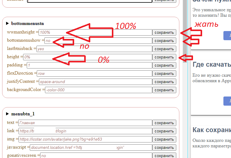 Жмите "СОХРАНИТЬ"Я понимаю, но так сложилось исторически. Просто прописывайте открытие нужной ссылки в поле JAVASCRIPT и жмите сохранить. Не думайте об остальных параметрах. Если интересно, то вот объяснение. Когда только начиналась разработка мобильного приложения оно содержало независимые компоненты вебвью для перемещения между страницами сайта без перезагрузки, как в браузере, но... Если используется нативная новостная лента, которая чаще всего нужна для модерации, то при повторном рендеренге экрана с вебвью происходит сбой. Поэтому по умолчанию дополнительные компоненты вебвью убраны. Просто игнорируйте режим multitab, если у вас версия с новостной лентой.